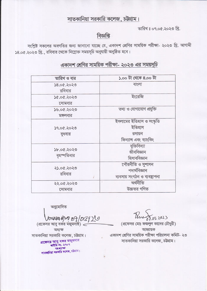 একাদশ ও দ্বাদশ শ্রেণির ক্লাস রুটিন