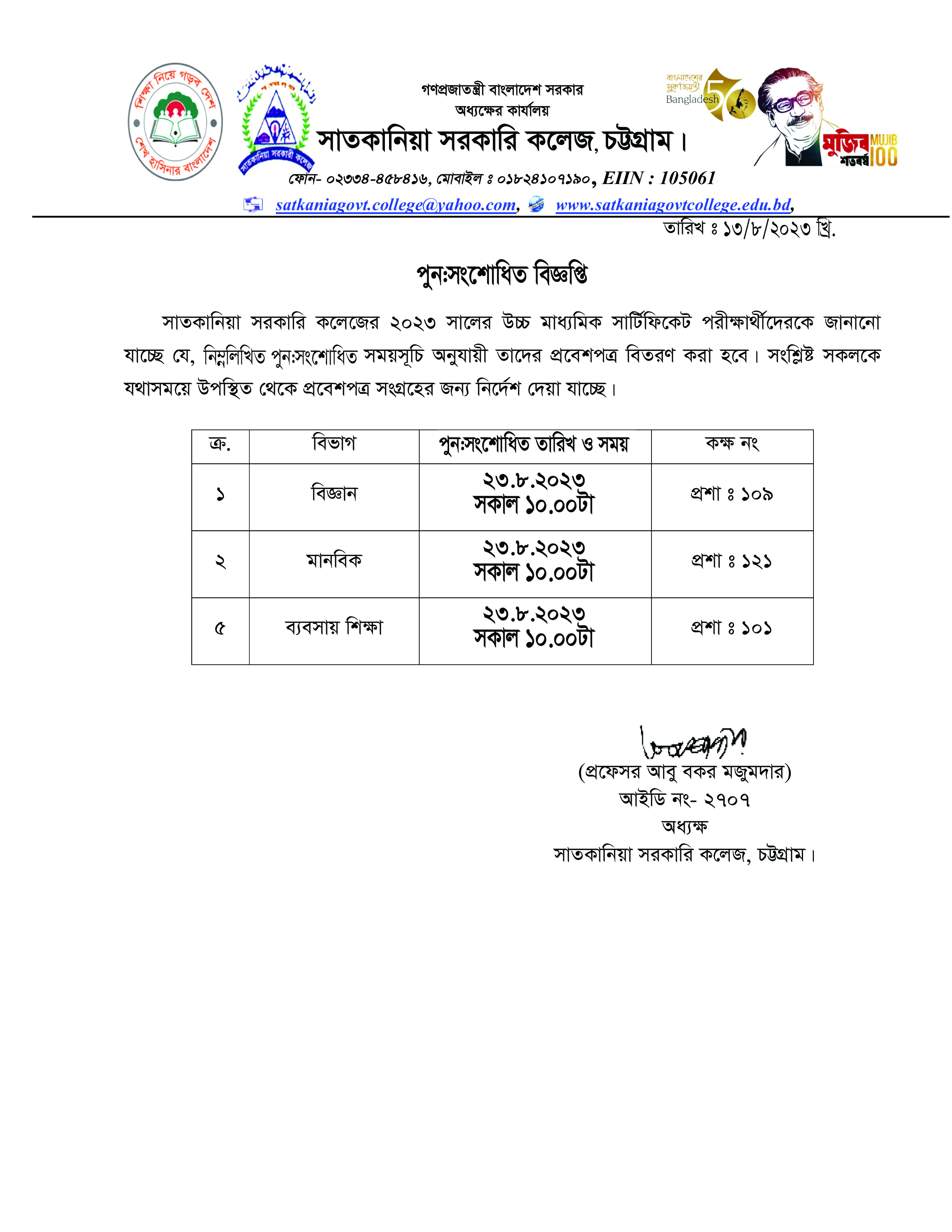 ২০২৩ সালের উচ্চ মাধ্যমিক পরীক্ষার্থীদের প্রবেশ পত্র প্রদান সংক্রান্ত পুনঃসংশোধিত বিজ্ঞপ্তি।