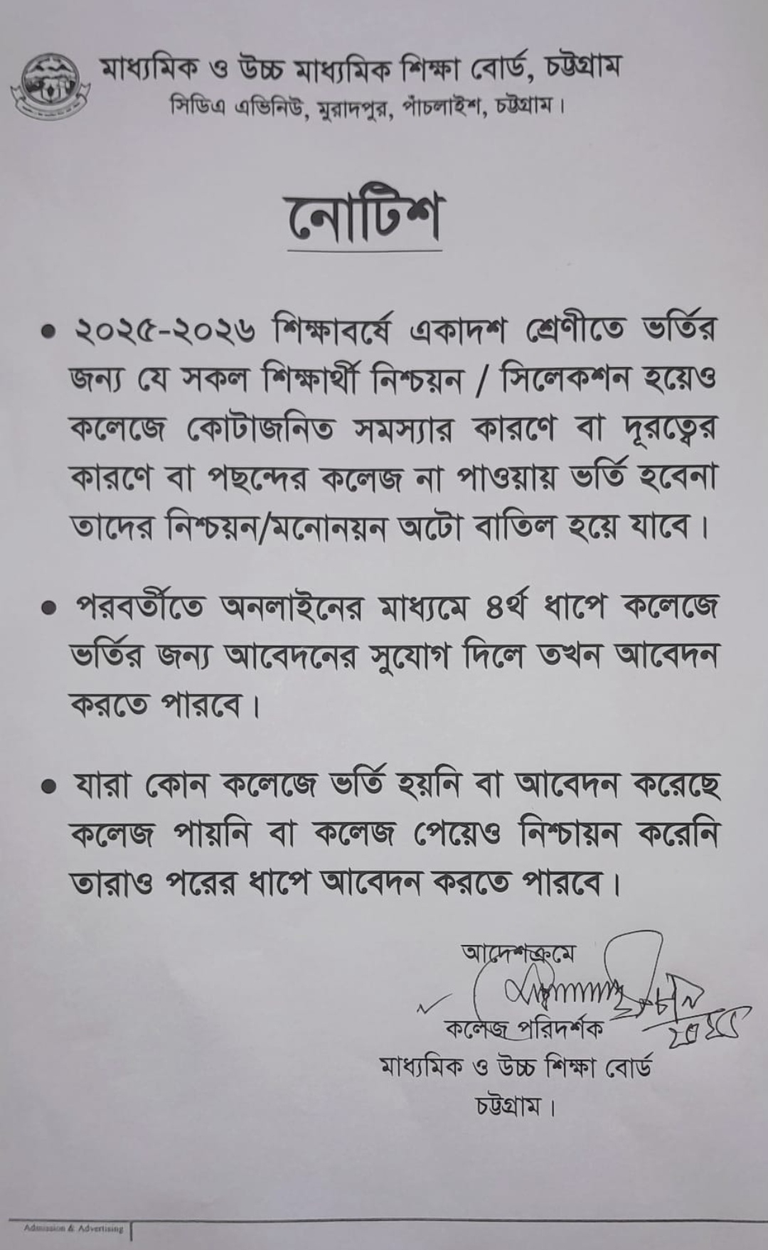২০২৫-২৬ শিক্ষাবর্ষের একাদশ শ্রেণির ভর্তি বিজ্ঞপ্তি