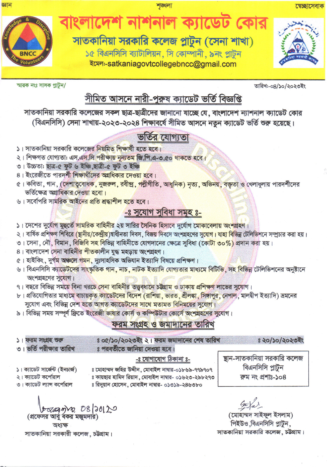 বাংলাদেশ ন্যাশনাল ক্যাডেট কোর (বিএন.সি.সি), সাতকানিয়া কলেজ শাখায় ভর্তি বিজ্ঞপ্তি