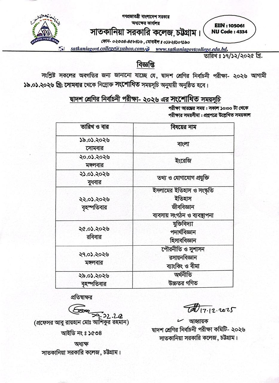 দ্বাদশ শ্রেণির নির্বাচনী পরীক্ষা- ২০২৬ এর সংশোধিত সময়সূচি